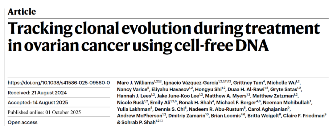 Tracking clonal evolution during treatment in ovarian cancer using cell-free DNA. Nature. 2025 Oct 1.