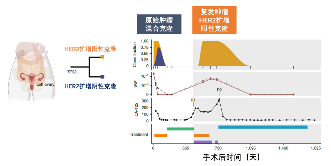 分析发现,她的原发肿瘤其实有两个亚克隆,几乎是1比1的比例混合。其中一个亚克隆有HER2基因扩增,另一个没有。和上一位患者类似,她的化疗后效果也不错,肿瘤标志物CA-125下降,影像显示肿瘤负荷减少,ctDNA也在第156天显示清零,一切看起来都很好。