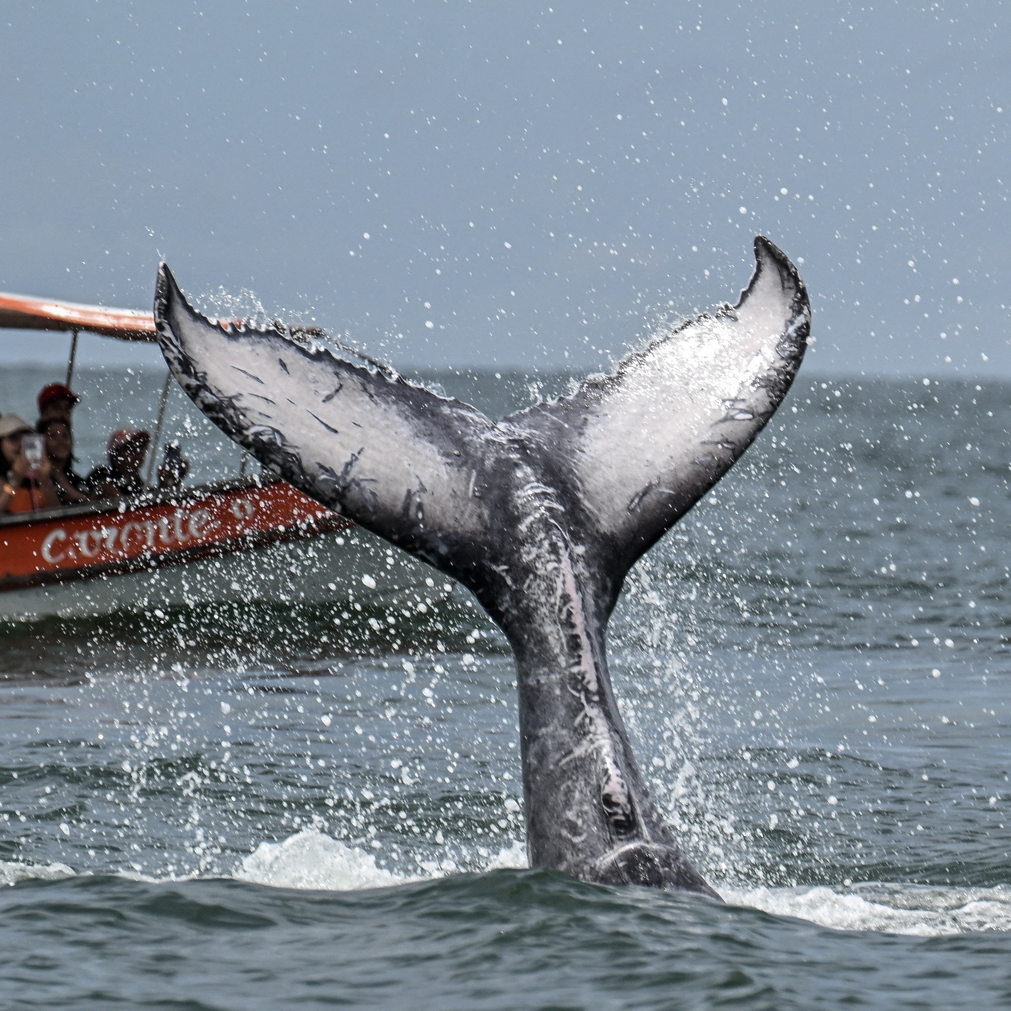 游客们坐船出海观赏鲸鱼,一头座头鲸跃出水面,哥伦比亚马拉加湾。马拉加湾是南太平洋座头鲸的主要繁殖地之一,每年7月中旬至10月下旬迎来最佳观鲸季,鲸鱼将从南极洲游至哥伦比亚的温暖海域进行繁殖,迁徙距离超过8000公里。摄影师:Joaquin Sarmiento