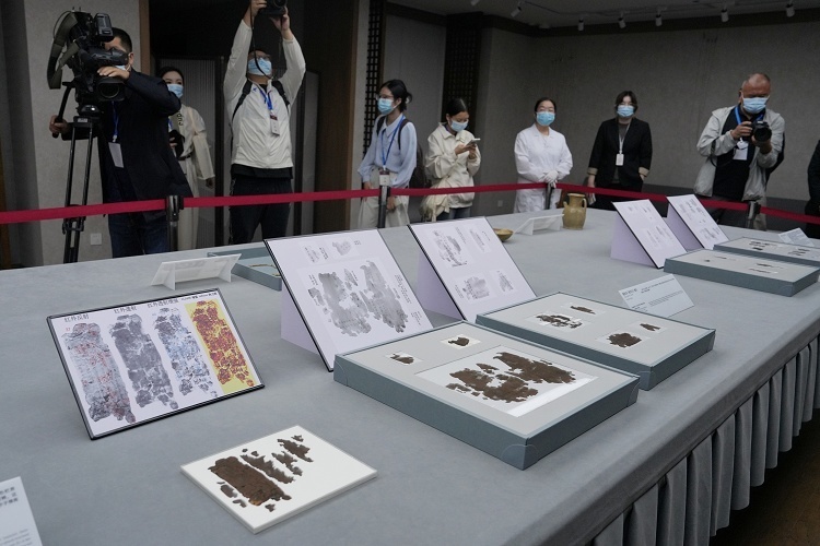 湖南省博物馆举行长沙子弹库战国帛书第二、三卷的入藏仪式。10月13日,长沙子弹库战国帛书部分残片在流失海外79年后入藏湖南省博物馆。长沙子弹库战国帛书共分三卷,是迄今中国出土年代最早的帛书实物及典籍类古书,1942年被盗掘后流散海外。本次回归的帛书残片共计132件,2025年由美国史密森尼学会归还中国政府。摄影师:Yang Huafeng