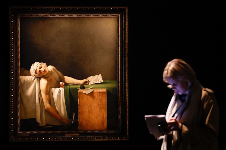 法国卢浮宫举办雅克-路易·大卫逝世200周年纪念展,一幅法国画家 Jacques-Louis David 创作于1793年的油画《马拉之死》正在展出,巴黎。10月14日,卢浮宫「雅克-路易·大卫」特展正式开幕,本次展览共汇集约100幅油画和素描作品,回顾法国新古典主义大师 Jacques-Louis David 的创作历程,聚焦其创作题材与法国近代史的紧密联系。展期持续至2026年1月26日。摄影师:Mohammed Badra